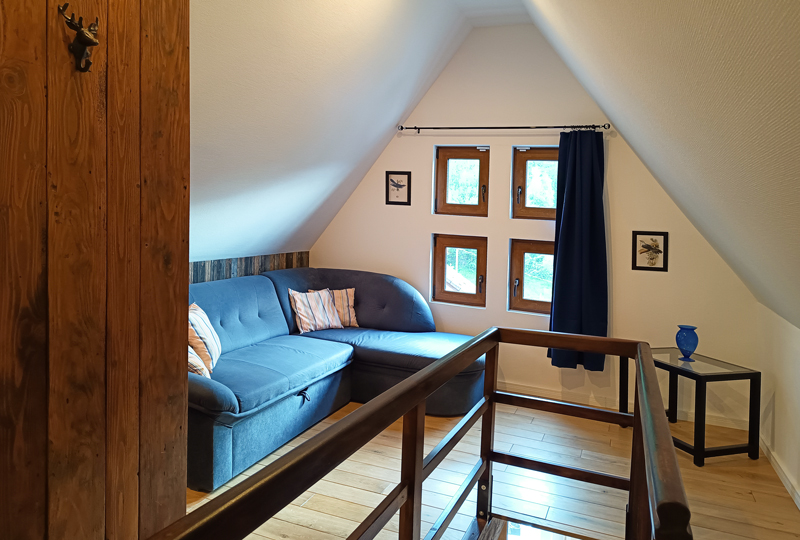 Die Schlafetage bietet ein Doppelbett (180 x 200 cm) sowie ein Schlafsofa.