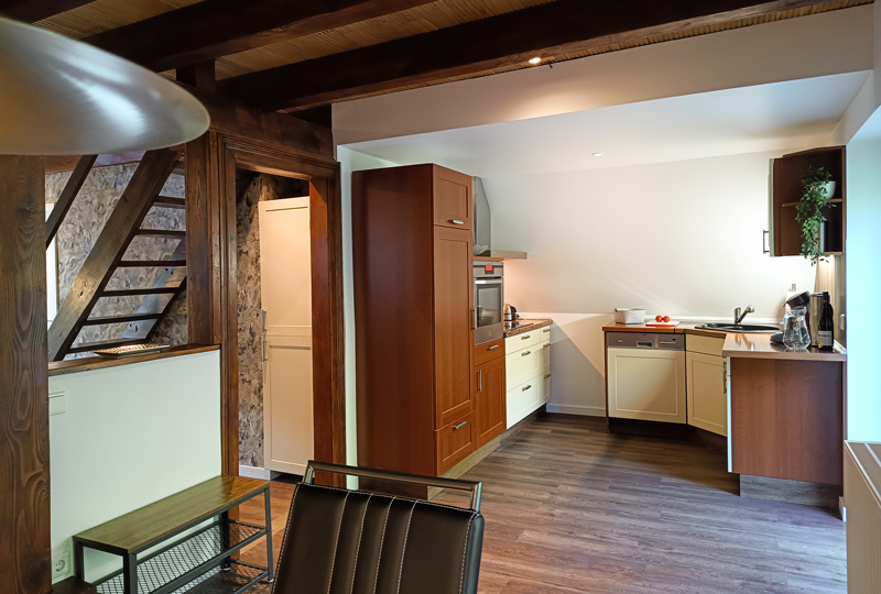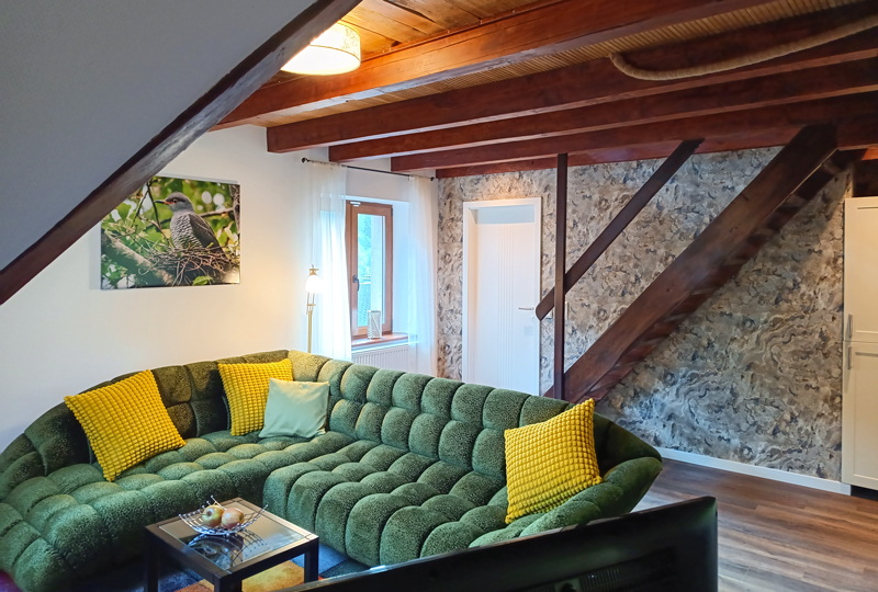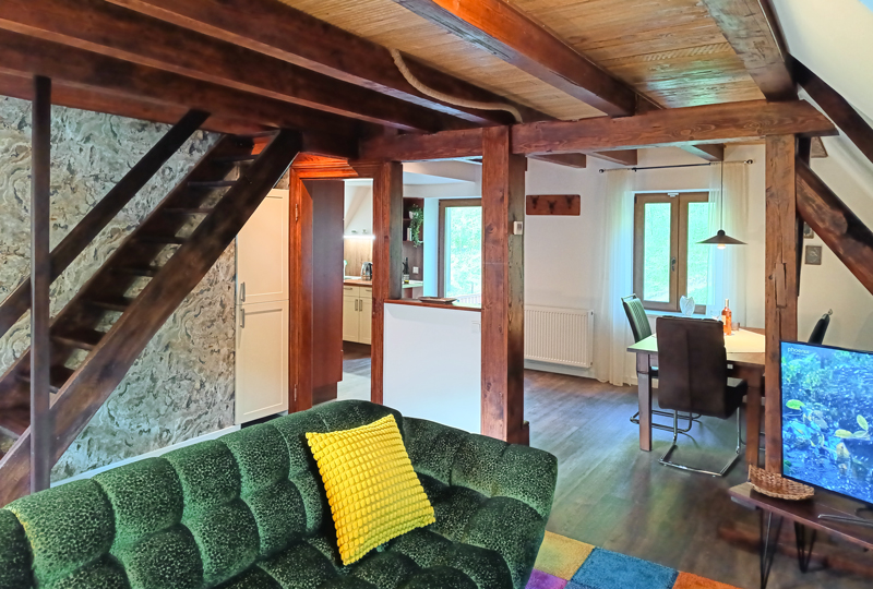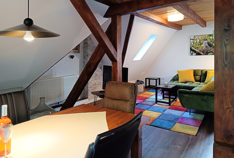 Sie verfügt über einen großen Wohn- und Essbereich mit offener Küche, ein Badezimmer und eine Schlafetage im Spitzboden.