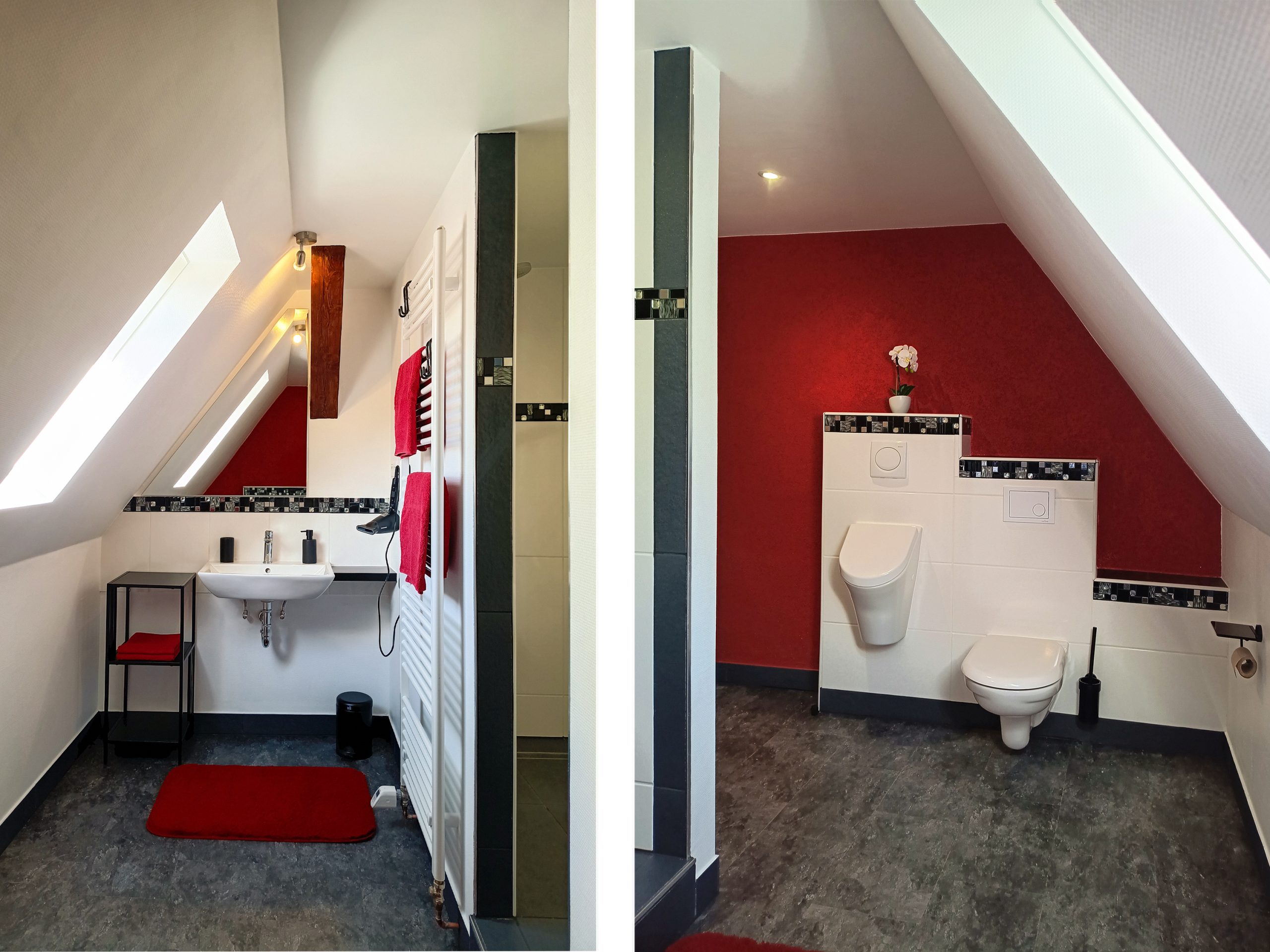Das Badezimmer ist mit einer Dusche, Waschbecken, Toilette und Urinal ausgestattet.